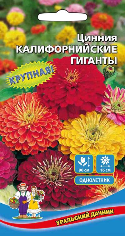 "Семена"Быстрорастущее однолетнее растение высотой до 90 см. Соцветия крупные, до 16 см в диаметре, разнообразной окраски. Цветет обильно и продолжительно. Используют для срезки, посадки в цветники, на клумбы. Хорошо сочетается с ноготками, бархатцами, вербеной. Неприхотливость, простота ухода, дружные всходы, долгое цветение в сочетании с разнообразием цвета и размера делают циннию весьма привлекательной для начинающих цветоводов.