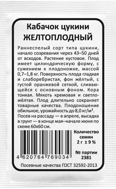 "Семена"Раннеспелый сорт типа цукини, начало созревания через 43–50 дней от всходов. Растение кустовое. Плод имеет цилиндрическую форму, с сужением к плодоножке, массой 0,7–1,8 кг. Поверхность плода гладкая и слаборебристая, фон жёлтый, с густой оранжевой сеткой, сливающейся с основным фоном. Кора тонкая. Мякоть кремовая и светло-жёлтая. Плод длительно сохраняет товарные качества. Плодоношение обильное, урожайность до 8,0 кг/м².