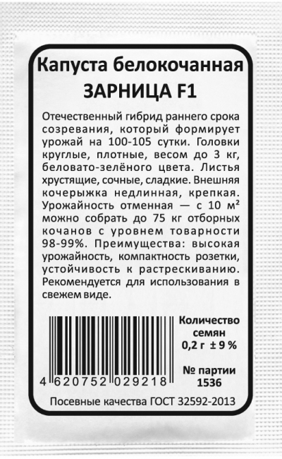"Отечественный гибрид раннего срока созревания, который формирует урожай на 100-105 сутки. Головки круглые, плотные, весом до 3 кг, беловато-зелёного цвета. Листья хрустящие, сочные, сладкие. Внешняя кочерыжка недлинная, крепкая. Урожайность отменная — с 10 м² можно собрать до 75 кг отборных кочанов с уровнем товарности 98-99%. Преимущества: высокая урожайность, компактность розетки, устойчивость к растрескиванию. Рекомендуется для использования в свежем виде.