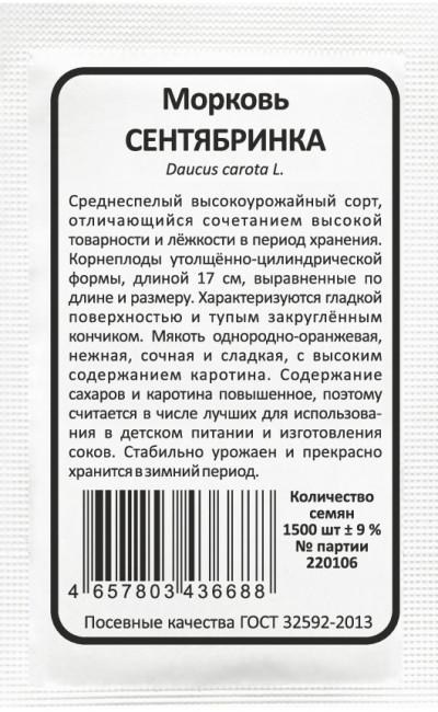 Среднеспелый высокоурожайный сорт, отличающийся сочетанием высокой товарности и лёжкости в период хранения. Корнеплоды утолщённо-цилиндрической формы, длиной 17 см, выравненные по длине и размеру. Характеризуются гладкой поверхностью и тупым закруглённым кончиком. Мякоть однородно-оранжевая, нежная, сочная и сладкая, с высоким содержанием каротина. Содержание сахаров и каротина повышенное, поэтому считается в числе лучших для использования в детском питании и изготовления соков. Стабильно урожаен и прекрасно хранится в зимний период.