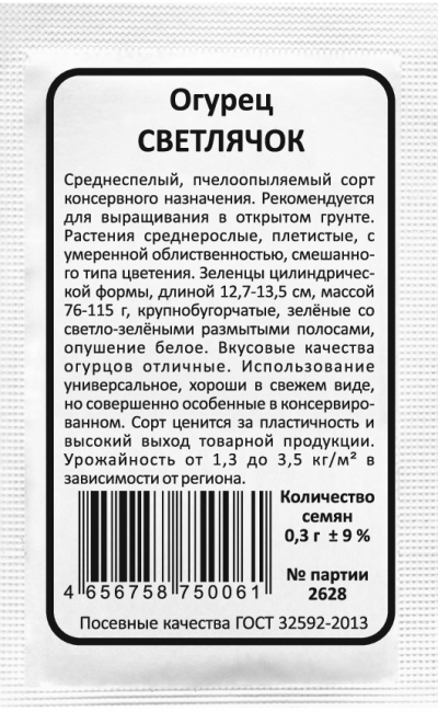 Среднеспелый, пчёлоопыляемый сорт консервного назначения. Рекомендуется для выращивания в открытом грунте. Растения среднерослые, плетистые, с умеренной облиственностью, смешанного типа цветения. Зеленцы цилиндрической формы, длиной 12,7-13,5 см, массой 76-115 г, крупнобугорчатые, зелёные со светло-зелёными размытыми полосами, опушение белое. Вкусовые качества огурцов отличные. Использование универсальное, хороши в свежем виде, но совершенно особенные в консервированном. Сорт ценится за пластичность и высокий выход товарной продукции. Урожайность от 1,3 до 3,5 кг/м² в зависимости от региона.