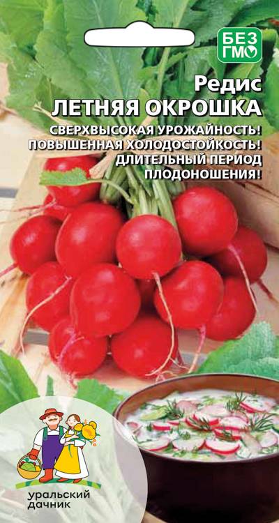 Если говорить о редисе, лучшим из лучших по скороспелости, урожайности и качеству корнеплодов является ЛЕТНЯЯ ОКРОШКА. Всего каких-то 20-25 дней (или меньше, самое быстрое созревание составляет 18 суток) пройдет от появления всходов, и можно готовиться к массовой уборке урожая. Созревание будет очень дружное — такова особенность сорта. Так как растение буквально запрограммировано на устойчивость к цветушности, посевы возможны с ранней весны до осени, в открытом или защищённом грунтах. Где ни посеете — урожайность порадует. Как и качество корнеплодов, у которых белоснежная, сочная мякоть, очень приятного, сладковатого, без горчинки вкуса. Масса их 20-25 г, они круглые, ровненькие, продолжительное время сохраняют товарные свойства, не дрябнут. Кстати, листья редиса также вполне съедобные: их можно использовать в салатах, гарнирах или горячих супах.
