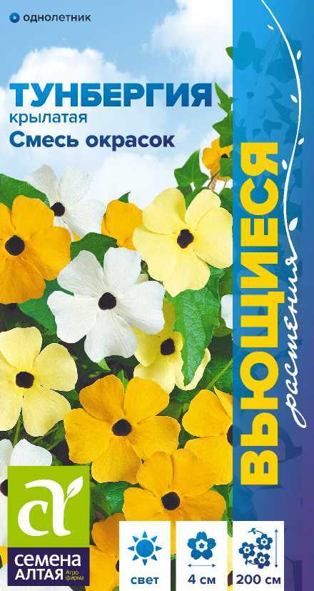 Быстрорастущая лиана, выращиваемая в садах как однолетник. Получила и другое название - Черноокая Сюзанна - за цветки с темным зевом (глазком). Стебли 1,5-2 м длиной с множеством сердцевидных листьев, контрастирующих с желтыми, кремовыми, персиковыми и оранжевыми цветками диаметром до 4 см. Растение смотрится объемным, благодаря особому расположению листьев и цветков. Используется для вертикального озеленения садовых сооружений.