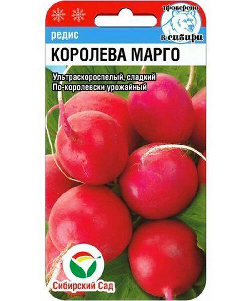 Раннеспелый, высокоурожайный сорт. Период от полных всходов до технической спелости всего 25 дней. Хорошо переносит пониженные температуры. Розетка листьев низкая, компактная. По-королевски красивые корнеплоды: с блеском, ровные, округлой формы, темно-красного цвета, диаметром до 3,5 см, массой до 20 г. Мякоть белоснежная, плотная, хрустящая, нежная и очень сочная, с повышенным содержанием витаминов. Не образует пустот, не дрябнет и не грубеет. Сорт устойчив к цветушности, не растрескивается хорошо переносит высокие и низкие температуры. Посевы можно производить в течение весны и лета, с апреля по август включительно. Хорошо растет как в открытом грунте, так и в теплицах, в условиях пониженной освещенности. Товарная урожайность 2,5-3,4 кг/м².