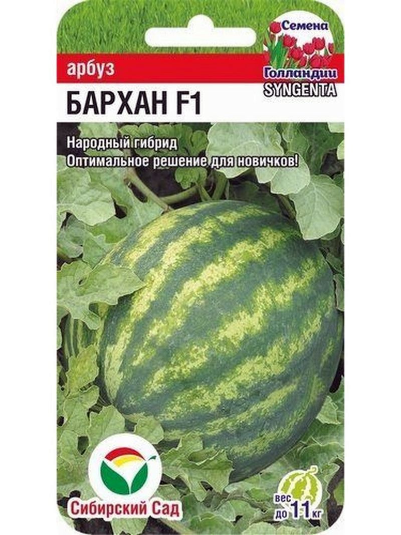 Растение мощное с отличной силой роста, плети короткие. Хорошо завязывается в любых условиях. Плоды овально-округлой формы, очень крупные 8-11 кг. Мякоть ярко-красная, без волокон, сахарная на изломе, хрустящая. Вкус сладкий с выраженным арбузным ароматом. Кожура не толстая, но плотная, что позволяет легко транспортировать и хранить арбузы.