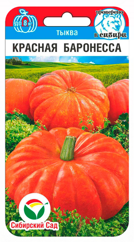 Среднеспелый ( 105-110 дней)сорт с плодами внушительных размеров. Неприхотлив в уходе, отлично хранится после сбора в зимний период. Привлекательные яркие оранжево-красные плоды достигают массы до 8кг, легко режутся, обладают хорошим вкусом и приятным запахом без приторного «тыквенного аромата». Сорт предназначен для выращивания в открытом грунте , рекомендуется для употребления в кулинарии в летний и осенне-зимний период.
