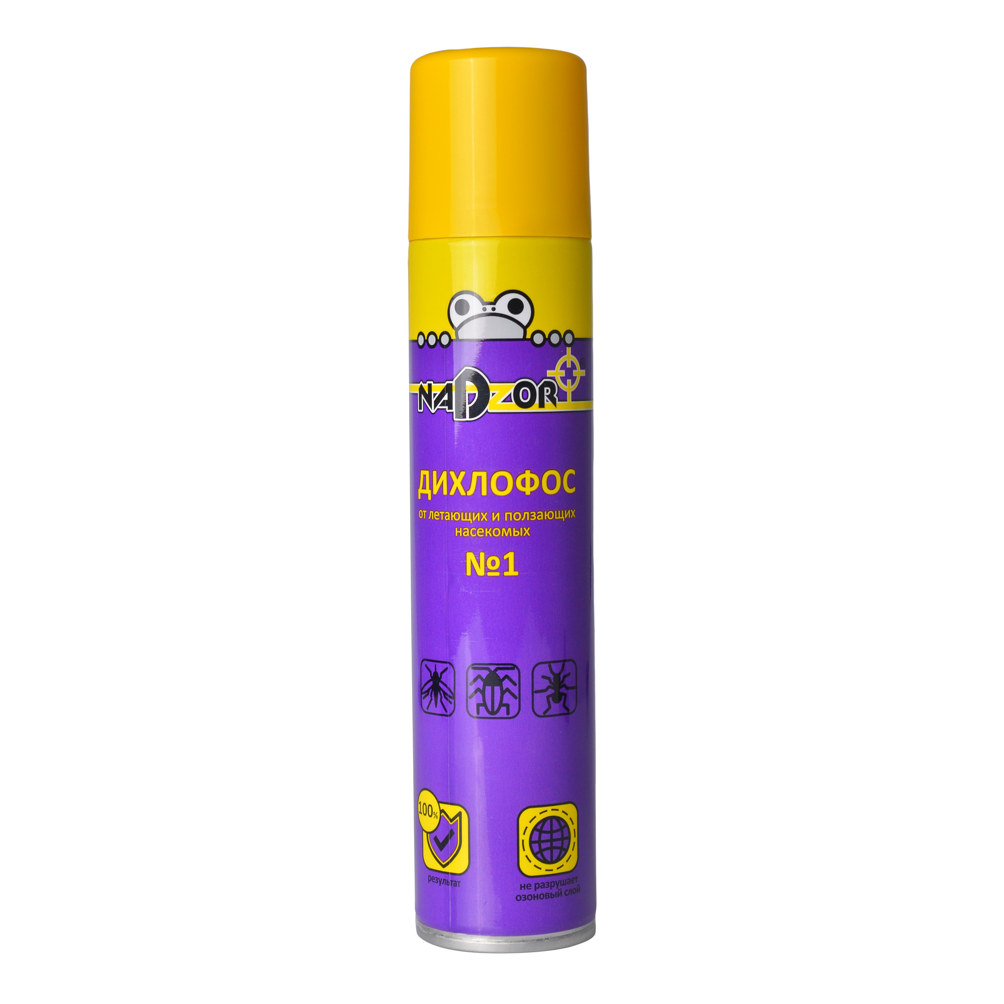 Средство обладает широким спектром инсектицидного действия в отношении летающих и нелетающих насекомых. При распылении дихлофос Nadzor молекулы действующих веществ начинают постепенно распространяться по всему помещению, начиная уже через 15 минут воздействие на тараканов, клопов, блох, муравьев, мух, комаров и других. В составе средства инсектициды контактного и кишечного действия, которые попадают через дыхательные пути насекомого, его хитиновый покров и пищеварительную систему. Дихлофос обладает пролонгированным действием: работает 14 дней после обработки.