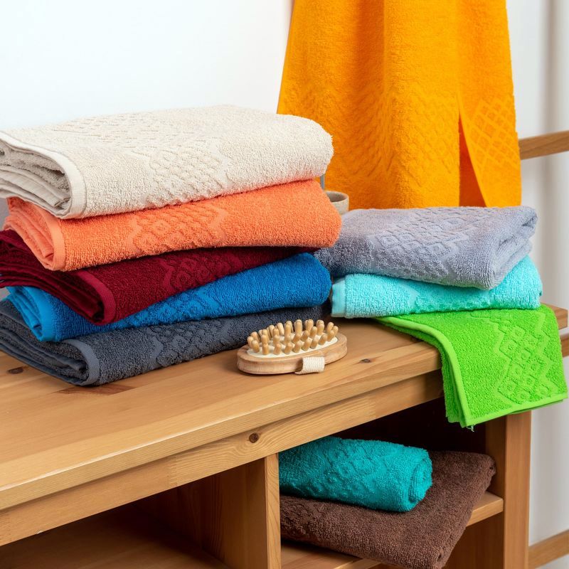 Махровое гладкокрашеное полотенце выполнено из 100%-ного хлопка. Замысловатый стилизованный узор передан рельефными геометрическими фигурами. Сочетание разных размеров ромбов создает визуальный эффект 3D.